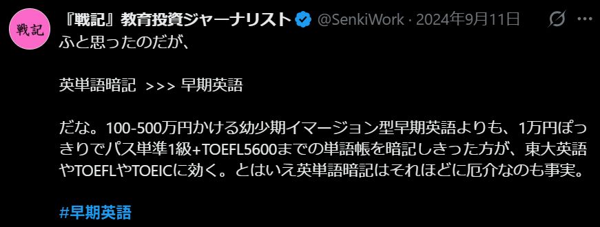 だな。100-500万円かける幼少期イマージョン型早期英語よりも、1万円ぽっきりでパス単準1級+TOEFL5600までの単語帳を暗記しきった方が、東大英語やTOEFLやTOEICに効く。とはいえ英単語暗記はそれほどに厄介なのも事実。