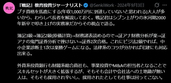 簿記3級→簿記2級(原価計算)→財務諸表読めるので→証アナ財務分析が楽→証アナの鬼門証券分析で挫けない→証券2次合格。これにビジ法2級やれば、中小企業診断士1次は楽勝ゲームになる。法律系のコツが分かれば宅建にも対応出来る。