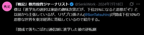 僕は「進学先の選択は家庭の趣味次第だが、下位25%になると悲惨だぞ」と以前から主張しているが、リザプロ孫さんが開成下位10%の悲惨な世界を東洋経済に寄稿しているので紹介する。