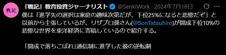 中3/Twitterの記録:「僕は「進学先の選択は家庭の趣味次第だが、下位25%になると悲惨だぞ」と以前から主張している」