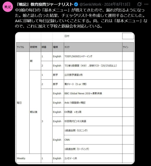 中3/Twitterの記録:「中3娘の毎日の「基本メニュー」が増えてきたので、漏れが出るようになった。娘と話し合った結果、チェックリストを作成して運用することにした。」