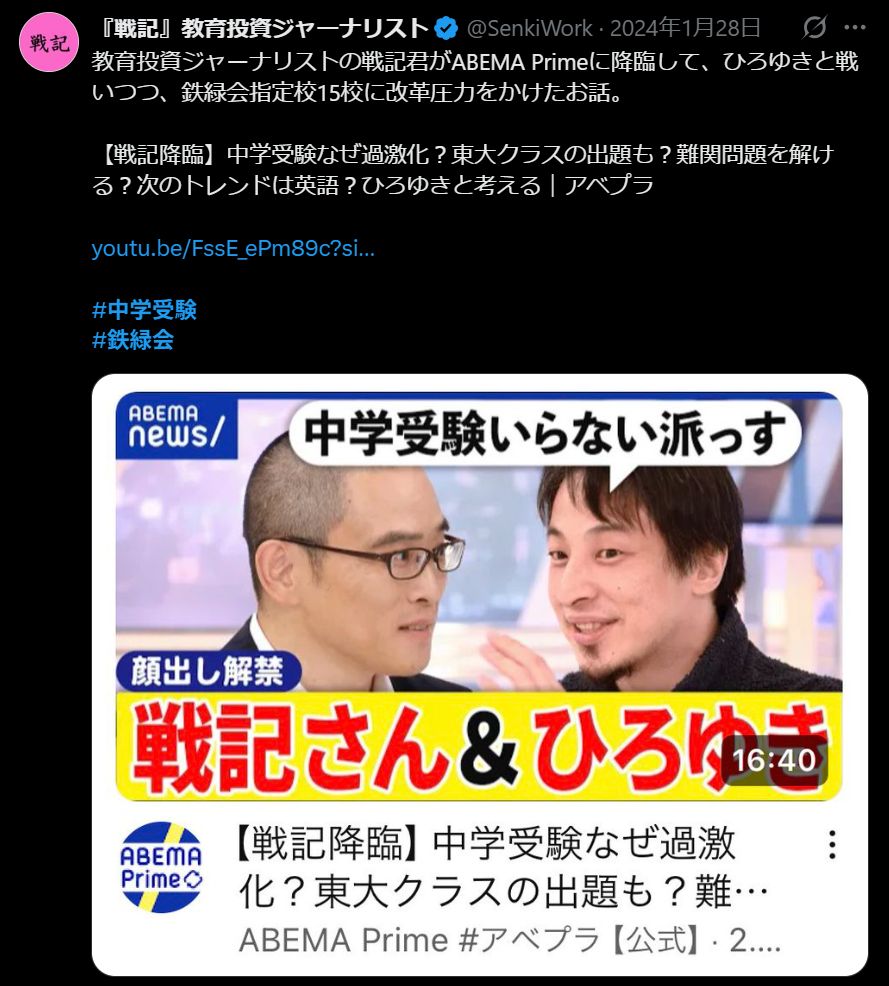 新中3/Twitterの記録:「教育投資ジャーナリストの戦記君がABEMA Primeに降臨して、ひろゆきと戦いつつ、鉄緑会指定校15校に改革圧力をかけたお話。」