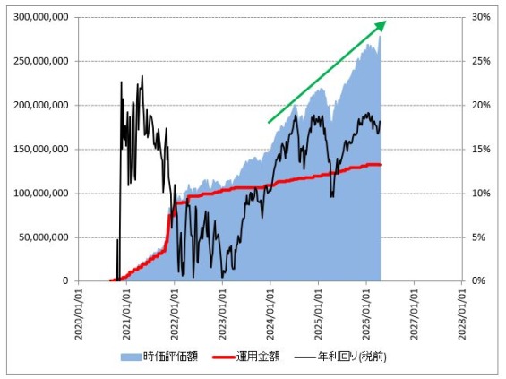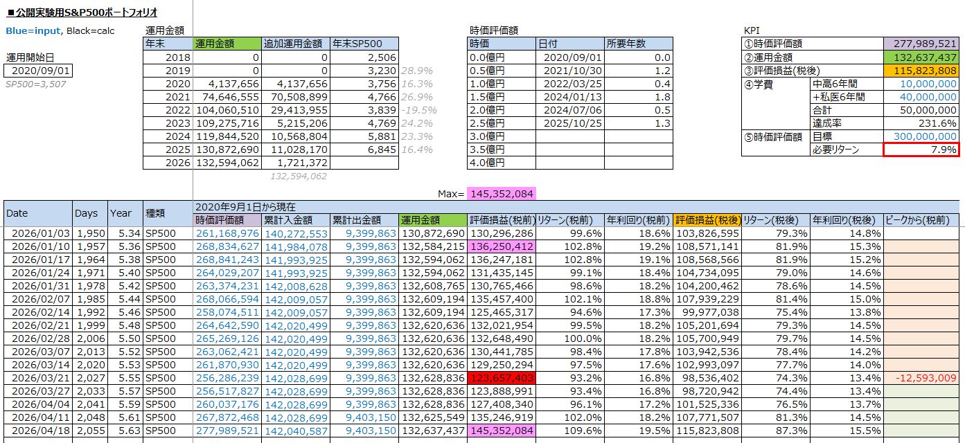 鉄緑会への資産運用:【過去最高益】S&P500投資の運用結果(評価損益/税前:+145,352,084円 / 2026年4月18日(土))