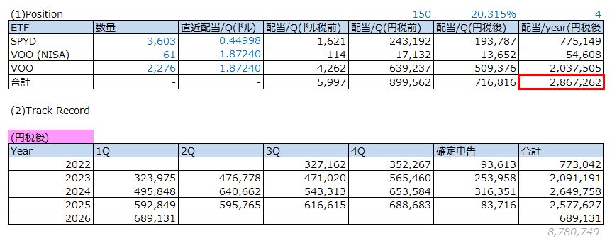 現在、娘が約1,600万円(=中高6年間学費+早慶理系4年間学費)をSPYDで運用しており、配当金で鉄緑会に通っています。残りの運用は僕のVOOです。
