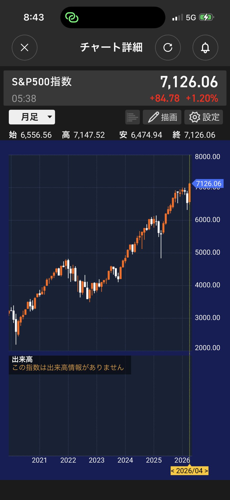 ・・・本日も八ヶ岳オフィスから記録。ホルムズ海峡開通への期待先行で、S&P500が過去最高値を更新しています。7,000を超えたら、金曜日はあっという間に7,126。今回は1月10日(土)から11週間下落して3月21日(土)がボトムで、そこから回復するのに4週間かかったお話でした。