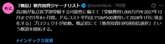 高2娘が私立医学部受験する可能性に備えて「受験費用1,000万円を2027年12月までの1年8ヶ月間、ドルコスト平均法でS&P500運用して2028年1月に現金化する」プロジェクトが始動。戦記君にて「教育投資目的別投信選択」という獣道を開拓する。