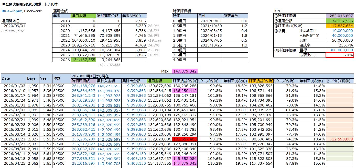 鉄緑会への資産運用:【過去最高益】S&P500投資の運用結果(評価損益/税前:+147,879,342円 / 2026年4月25日(土))
