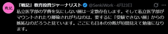 私立医学部の学費を気にしない層は一定数存在します。そして私立医学部がマウントされたり揶揄されがちなのは、要するに「受験できない層」からの嫉妬なのだろうと見ています。ここにも日本の分断が垣間見えて勉強になります。