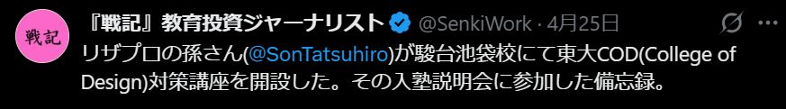 高2/Twitterの記録:「リザプロの孫さんが駿台池袋校にて東大COD(College of Design)対策講座を開設した。その入塾説明会に参加した備忘録。」