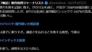 2025年8月2日(土)。【2026年2月10日(火)記録】 僕の失敗を記録に残す。7月31日(木)夜に、円安かつS&P500最高値に200万円を追加投資したが、8月1日(金)夜に雇用統計ショックで-3.67%の急落。 ...